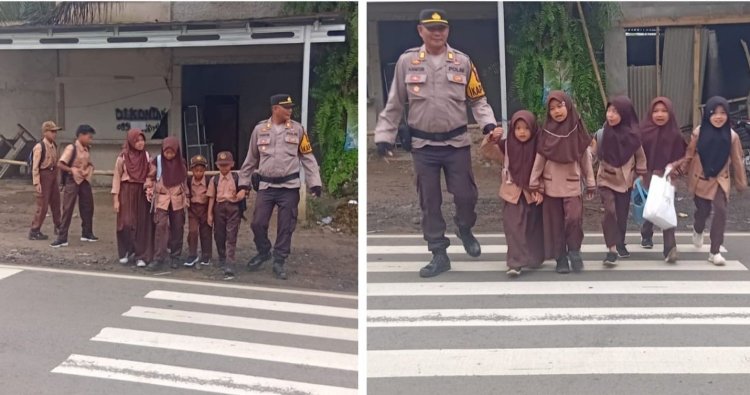Kapolsek Cikidang turut membantu para siswa menyeberang jalan serta memastikan arus kendaraan berjalan lancar di sekitar lokasi.