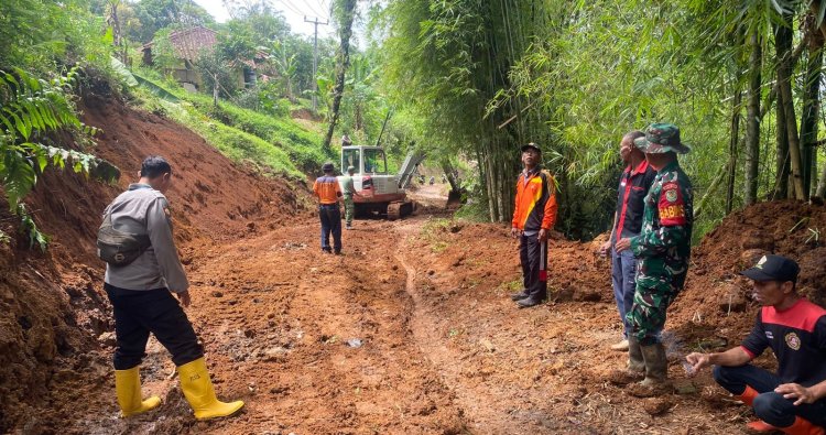 Kapolsek Nyalindung IPTU Sopian, S.Ag., bersama Bhabinkamtibmas, Babinsa, Kepala Desa, dan warga masyarakat melaksanakan kegiatan kerja bakti pembersihan material tanah pasca hujan deras dan longsor di Kp. Citanggeung RT 003/003 Desa Bojongsari, Kecamatan Nyalindung, Kabupaten Sukabumi, Kamis (01/01/2026).