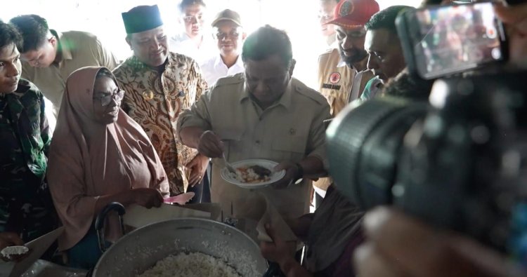 Usai menyapa warga, Prabowo melihat langsung proses memasak dan kemudian meminta izin kepada juru masak di tenda dapur untuk mencoba hidangan yang dimasak untuk masak siang.