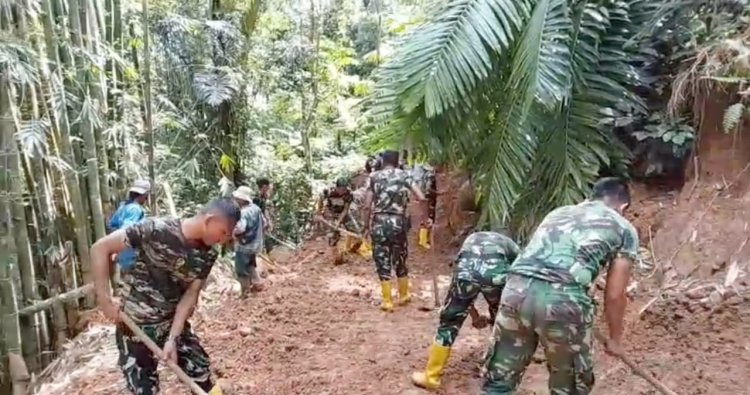 Berdasarkan video yang diterima, para personel TNI bekerja sama dengan masyarakat untuk memulihkan akses jalan yang terdampak bencana banjir dan longsor.