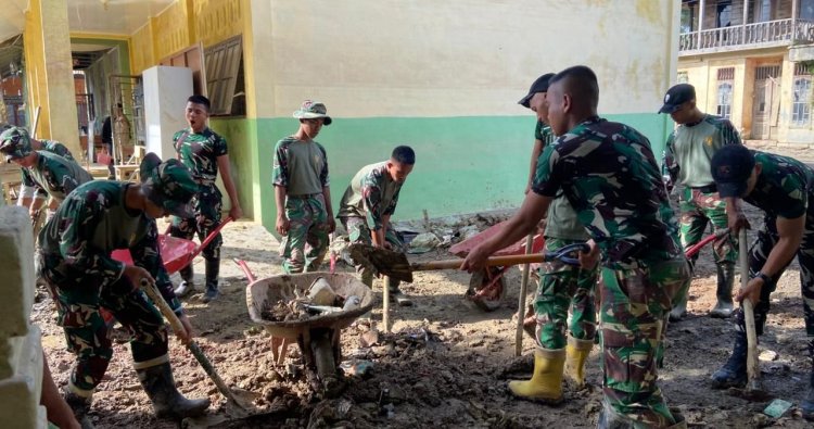 Para personel yang sebagian besar tergabung dalam Satuan Tugas Penanggulangan Bencana membersihkan baik bagian dalam maupun luar gedung sekolah. Lumpur-lumpur yang masih tersisa dan sudah mengeras disiram dengan air. Tumpukan material sampah yang terbawa banjir dan longsor pun dibersihkan.
