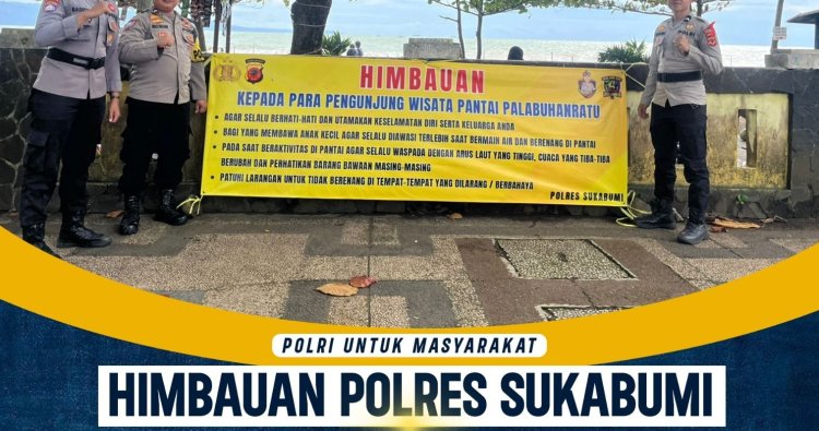 SUKABUMI – Anggota Polres Sukabumi memberikan imbauan langsung kepada masyarakat dan wisatawan agar berenang hanya di tempat yang aman dan memperhatikan keselamatan saat beraktivitas di kawasan perairan. Selain imbauan langsung, Polres Sukabumi juga memasang papan imbauan keselamatan di sejumlah lokasi wisata dan titik rawan di wilayah Kabupaten Sukabumi.