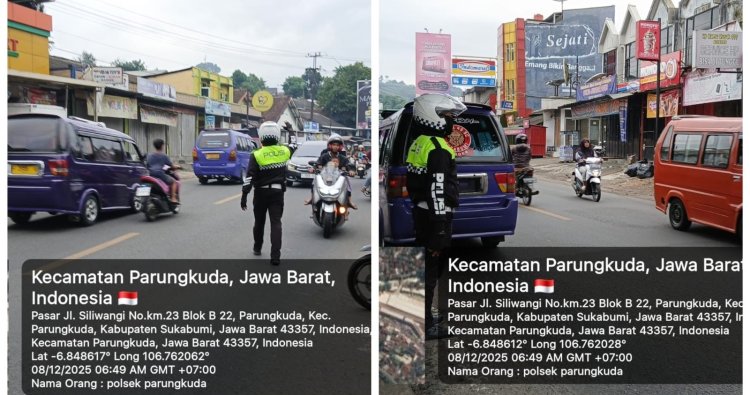 Sukabumi – Personel Unit Lantas Polsek Parungkuda Polres Sukabumi melaksanakan kegiatan pengaturan arus lalu lintas di kawasan Pasar Parungkuda dan simpang Stasiun Parungkuda pada Senin (08/12/2025) pagi.