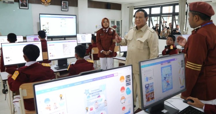 Selanjutnya, Prabowo kembali meninjau ruang komputer dan menyapa siswa-siswi. Saat ini, sistem pembelajaran di sekolah rakyat didukung dengan teknologi digital, termasuk learning management system dan laptop untuk siswa.