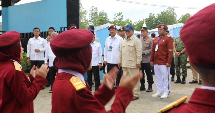 Didampingi Menteri Sosial (Mensos) Saifullah Yusuf, Prabowo pun membalas yel-yel sambutan dengan menyapa para siswa. Prabowo juga tampak memperbaiki seragam para siswa yang tengah melakukan baris berbaris.