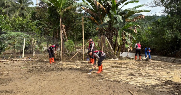 SUKABUMI – Personel Satuan Samapta Polres Sukabumi bergerak cepat melakukan pembersihan material banjir dan longsor yang terjadi di wilayah Kecamatan Nyalindung, Kabupaten Sukabumi, akibat hujan deras yang mengguyur kawasan tersebut.