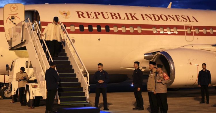 Presiden Republik Indonesia Prabowo Subianto tiba di Bandara International Minangkabau, Kabupaten Padang, Pariaman, Provinsi Sumatra Barat pada pukul 18:30 wib, Rabu (17/12).