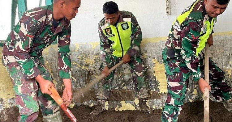 Para personel membersihkan baik bagian dalam maupun luar gedung sekolah. Lumpur-lumpur yang masih tersisa dan sudah mengeras disiram dengan air. Tumpukan material sampah yang terbawa banjir dan longsor pun dibersihkan.