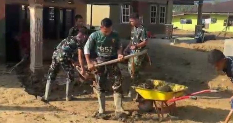 Di Kabupaten Aceh Tamiang, prajurit Satuan Setingkat Kompi (SSK) Yonif TP 852/ABY melakukan pembersihan di Desa Bandar Khalifah, Kecamatan Tamiang Hulu. Sejumlah rumah lansia dibersihkan secara bertahap, mulai dari halaman hingga bagian dalam rumah yang tertimbun lumpur tebal.