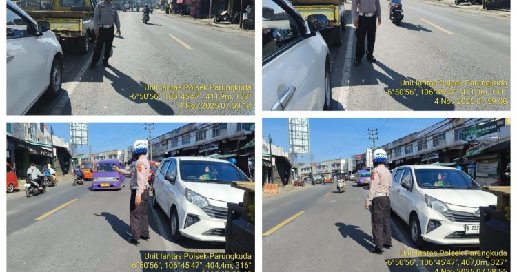 Parungkuda – Personel Unit Lantas Polsek Parungkuda Polres Sukabumi melaksanakan kegiatan pengaturan arus lalu lintas di kawasan Pasar Parungkuda dan Simpang Stasiun Parungkuda, Selasa (04/11/2025) pagi.